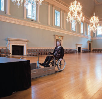 可舒适地容纳500人,现在经常用于戏剧、演讲和舞蹈等活动。此类活动通常需要在舞厅内搭建一个临时舞台,因此需要一个便携式解决方案来允许残疾人进入舞台。